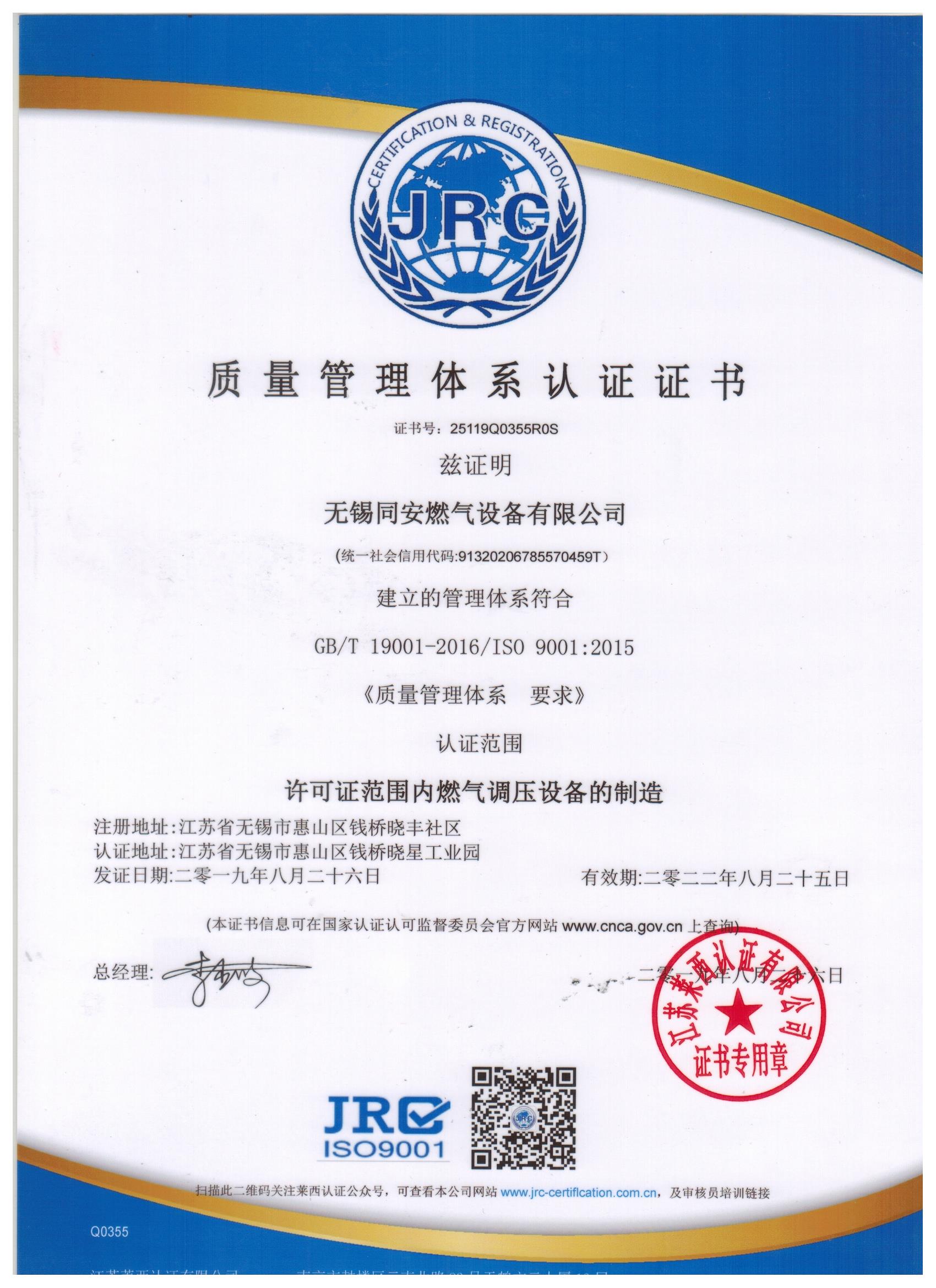 无锡同安燃气设备有限公司,于2006年3月成立,现座落无锡市惠山区钱桥晓星工业园。拥有先进生产制造设备和试验、验测、调试装置设备40余台,配备多名专业的科技管理人员,各类生产技术工人都由国家劳动部门培训上岗,劳动力资源配置十分合理,生产结构、产品结构、经济结构和组织结构更利于生产发展的需要。本公司是通过ISO9001-2016国际质量体系认证的企业。以技术开发、设备制造、销售、安装和信息服务为主的科、工、贸一体化公司。主要产品包括:燃气调压(计量)设备、城市门站、区域调压站、楼栋调压箱、调压柜、流量计量产品、过滤器、绝缘法兰(绝缘接头)、加臭设备(工控机、触摸屏、常规现场防爆产品可选)、燃气电磁切断阀及燃气输配监控系统(SCADA)等,并为用户提供产品技术开发、成套仪表安装和调试、产品技术信息服务。本公司在服务中坚持“质量为本,用户至上”的原则,以产品技术性能好、适用性强、精确度高、使用寿命长等特点。产品适用于居住小区、公共事业、商业及工业用户,适用于天然气、城市燃气、液化石油气等多种燃气气种。以更好的产品质量和精湛的技术服务受到了用户的一致好评。